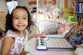 Find a nice quiet area, where she can feel comfortable. Sophia loves her room, so we sat at her table. She wanted to play the song ” Row, Row, Row your boat”. Once the selection of the song was made, she had to press the keys that match the numbered notes above each word.