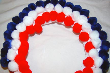 Take the white pompoms and damp each of them in some glue and place them behind the red pompoms.  Continue this process until the circle is complete. Keep a little section open on top to wrap your ribbon.